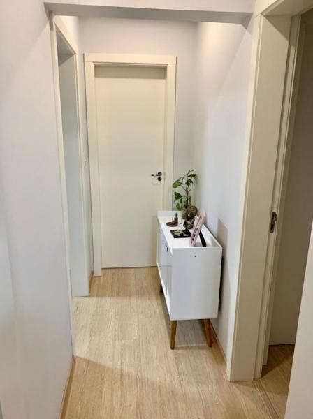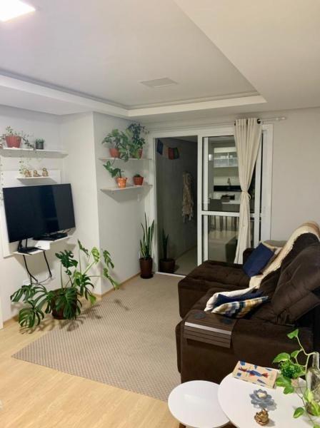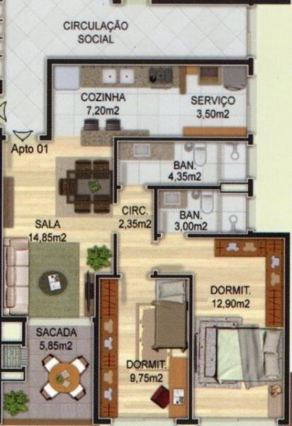 Internamente ele é dividido em sala 2 ambientes com varanda, 2 quartos, sendo uma suíte, banheiro social, cozinha e área de serviço.