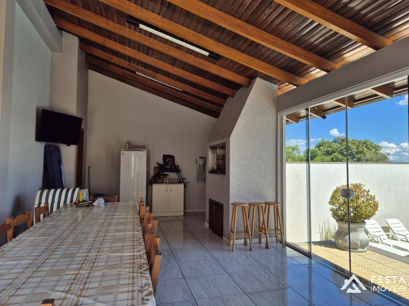 ⇒ andar inferior: sala de festas com lareira, garagem, banheiro, piscina, cozinha com fogão campeiro